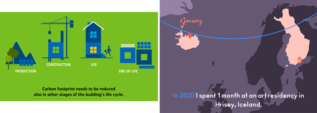 The first illustration is a scene from an animation on low-carbon construction for the Ministry of Environment. The illustration enhances the stages referred to and the cyclicity of the life cycle (which is more visible in the animation with parts rotating back from the final to the first phase).