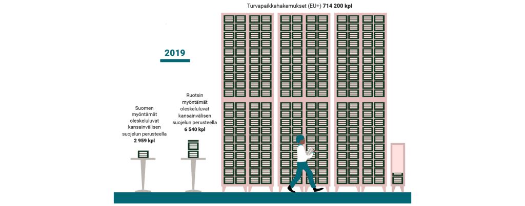 This data visualization was made for a publication on guidance of refugees. It shows the amounts of residence permits (on the basis of international protection) in Finland (2959) and Sweden (6540) in comparison to the amount of asylum applications in the European Union in 2019.