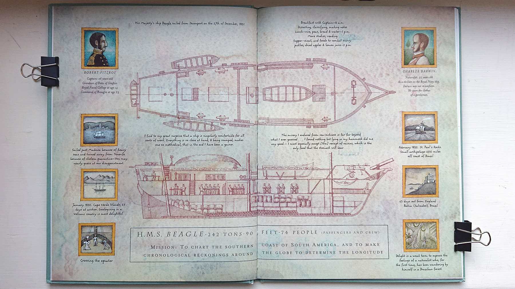 Peter Sís’s cutaway from H.M.S. Beagle, Charles Darwin’s ship departing from Devonport in 1831, shows the ship’s interiors, passengers and crew.