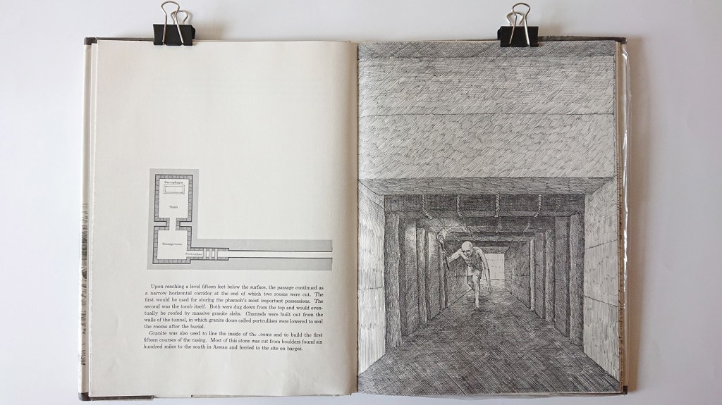 David Macaulay has made numerous impressive books where he dives deep into how things, machines or even entire buildings work. Pyramid is full of different sorts of cutaway illustrations on the construction and use of ancient Egyptian pyramids. Macaulay has a way to combine cutaway illustrations to beautiful full-bleed pictures – all black and white in Pyramid‘s case.