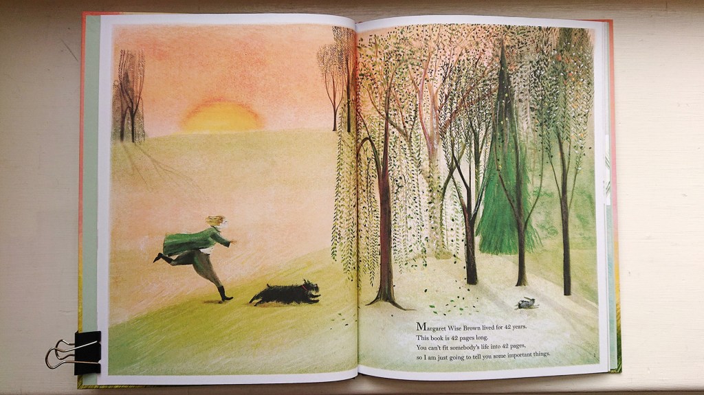 The Important Thing About Margaret Wise Brown tells about children’s book writer Margaret Wise Brown who lived a life of 42 years. The picture book has 42 pages. This structural undertone follows along throughout the picture book and creates tension, and should I say – a very visceral feeling of what you are reading through.