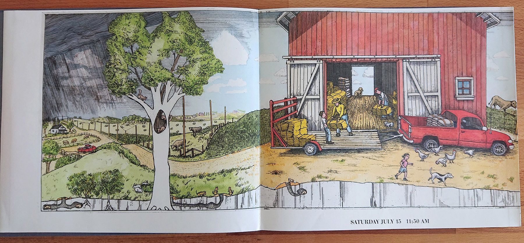 Arthur Geisert’s Thunderstorm is one of the best examples of a children’s picture book that is a data visualization. You could call it one wide graph. Graph, where x axis shows time – and y axis tells about the storm in a freedom-filled way! The storm comes, rages and moves forward, away from the pastoral setting we’re viewing. There’s an accordion edition of the book available, the kinship to a graph is even more evident in that version. Thunderstorm is a silent (/wordless) picture book, if the annotations of time in the bottom of some of the pages are not taken into account.