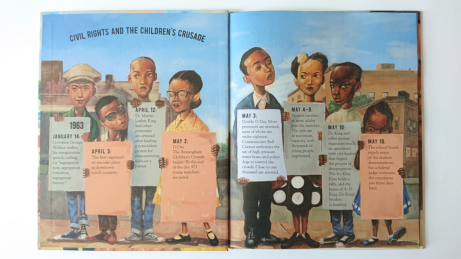 Signs as a timeline suits well the theme of this book. The timeline continues in the endsheets on the back, telling what happened after the children’s march.