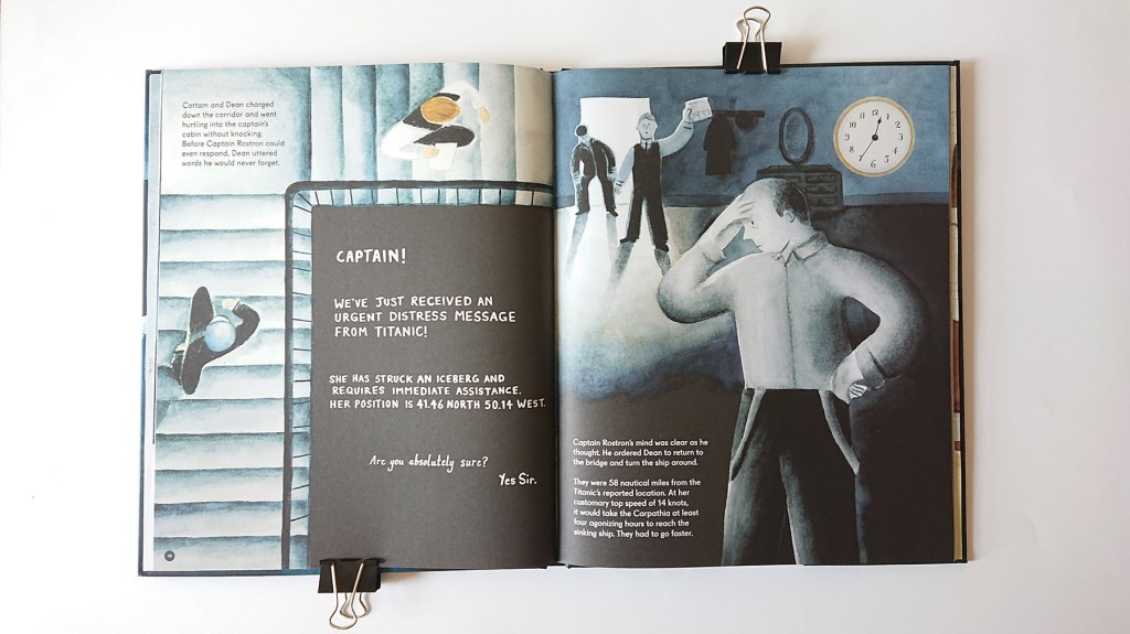 Time can be shown in a very daily life kind of way, too: In Rescuing Titanic the reader is kept up to date with time and pace of events by watches (different ones on Titanic and Carpathia) showing the time on nearly every spread. The picture book is very suspenseful, and staying up to date on whether there is hope for Titanic or not (even though you should know…) makes you look at the time in the watches closely!