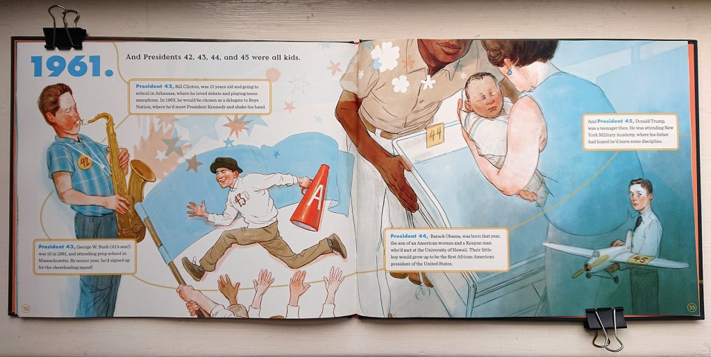 The Next President is structured around four years: 1789, 1841, 1897 and 1961. The spreads show what presidents alive that year were doing, and of course how old they were. The book’s view on time is thought-provoking: “At least ten of our future presidents are probably alive today.” is how it ends. The future is wide open!