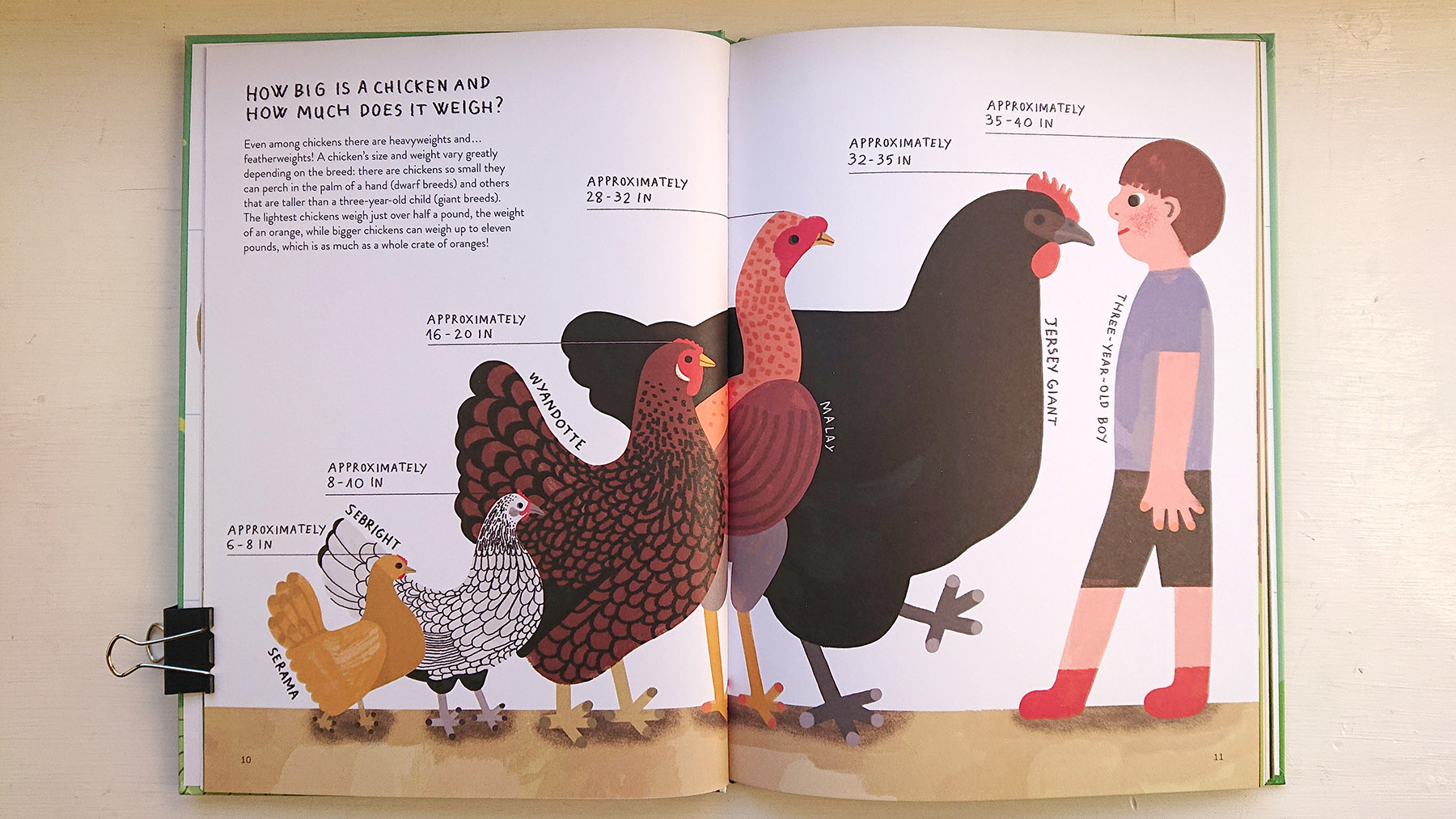 The numbers can be there, of course, like in Chickenology. But the numbers are additional information: the grand focus of the illustration is on the boy and the chickens, especially the big black one. Here the comparison is of height.
