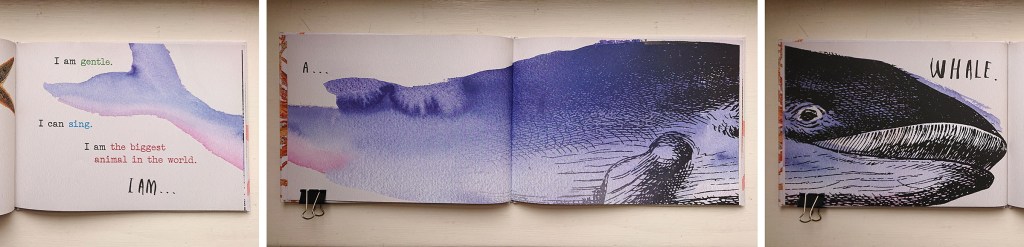 Heads and Tails Underwater is a good example of a very picture book kind of way to show and compare size. Most of the other animals in the book only take up two pages on two spreads. But the whale takes 4 pages on 3 spreads: a whole extra spread, as can be seen in the picture above, because of its size.