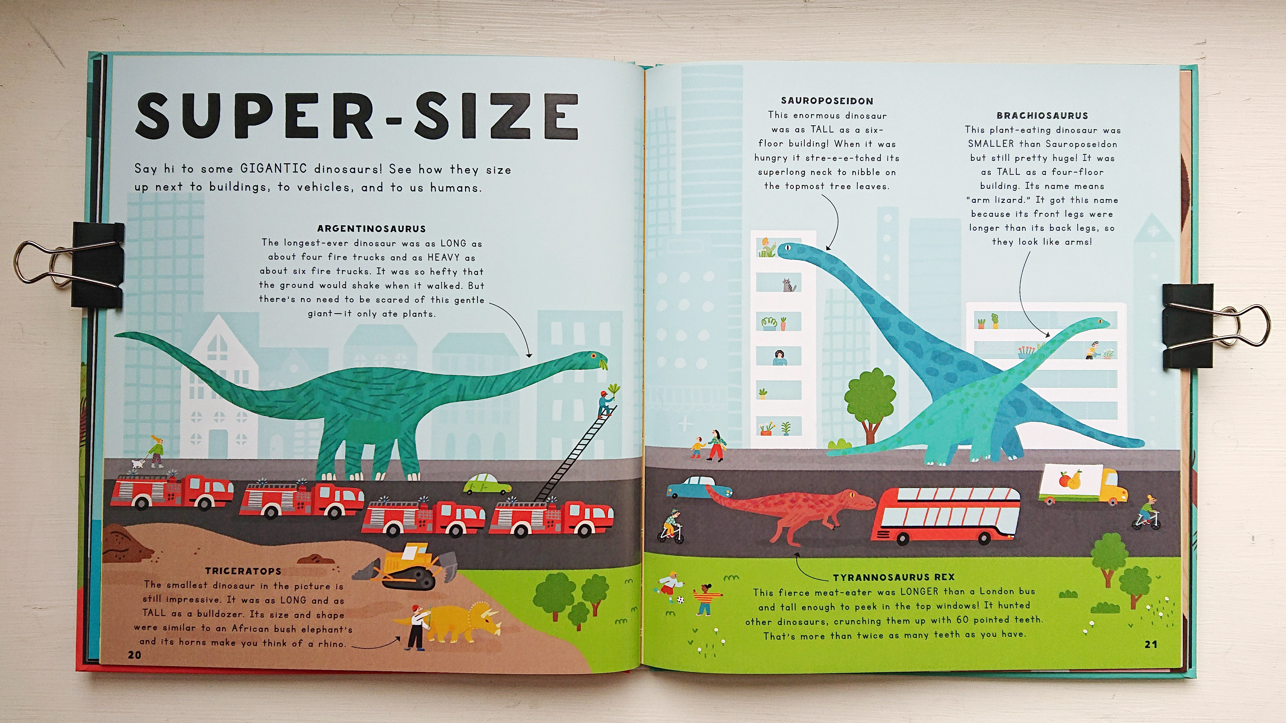 The book by Sara Hurst and Ana Seixas, built around visual comparisons, does a good job. The comparisons are easy to grasp: You don’t necessarily need to read the text to understand that the T-rex is the size of a Londoner bus, or that the triceratops is the size of a bulldozer. Feather lengths are compared to a pencil and a large banana. The measuring tape, given to show the length of Anchiornis, gives you a one-step-further comparison to the real world’s measures.