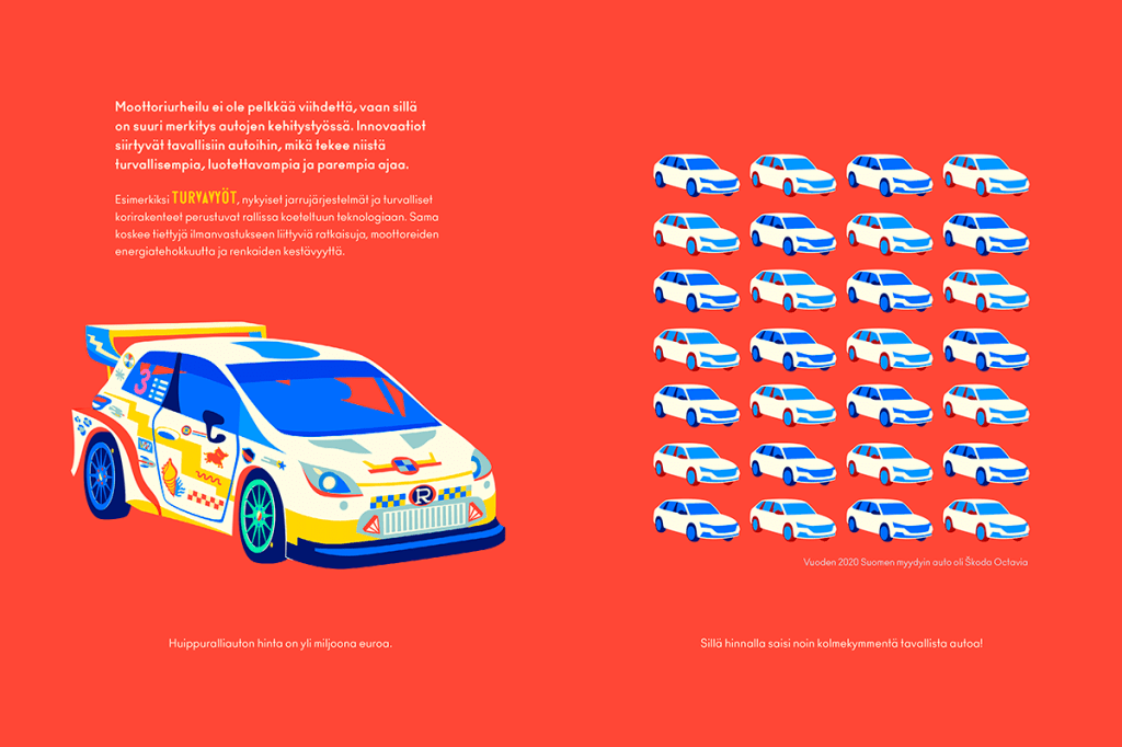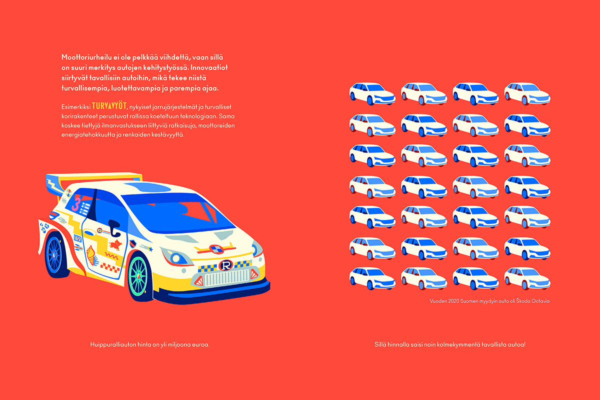 This spread of Rallitalli, a nonfiction picture book about rally car racing that I’ve illustrated, compares the price of one rally car to normal cars, but the main text talks about the significance of motor sports: how it’s not just entertainment but a testing ground for new innovations later moving forward to mass production, among them seat belts. The spread with this message is among the most important ones in the book, and that’s why it has a red background. And it has a repetitive, steady rhythm: the illustration is not leaning towards a specific direction.