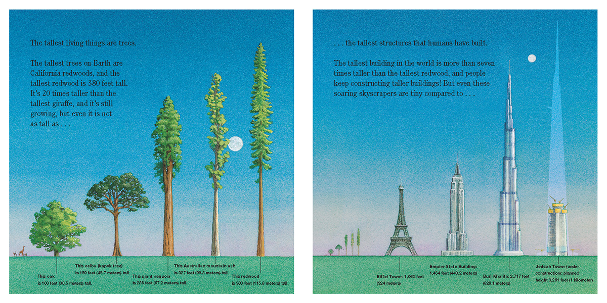 In the last couple years I have read through hundreds of nonfiction picture books and paid attention to their ways of visualizing information and data. I did think I would find more numerical data visualizations in children’s nonfiction picture books than I ended up finding. When you do find numerical visualizations, it is usually timelines, visual comparison of size, height, length or area, and sometimes quantities. Maps can be found very often.